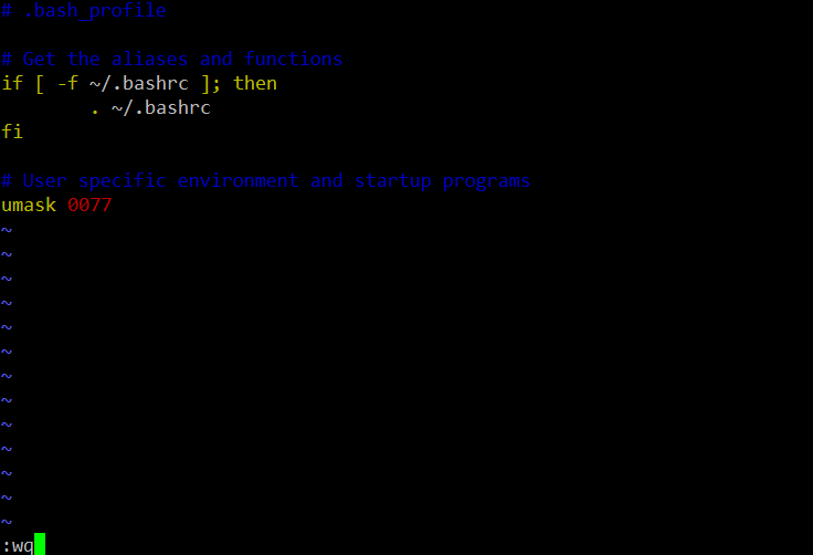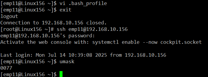vi에디터로 제일 밑에 umask 0077 입력하고 저장합니다.(home디렉터리에 있는 emp11만 적용)