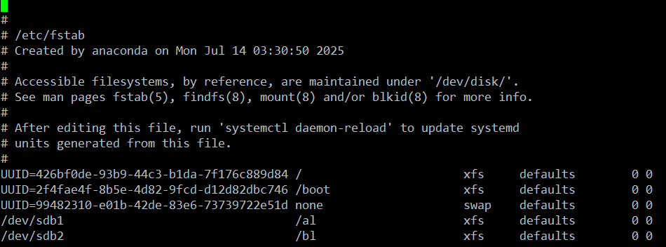 - 파일은 시스템 시작 시 자동으로 mount할 파일 시스템의 목록이나 옵션을 저장합니다.
