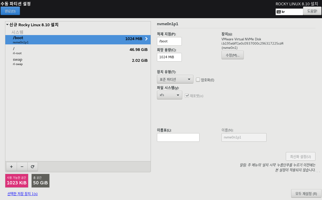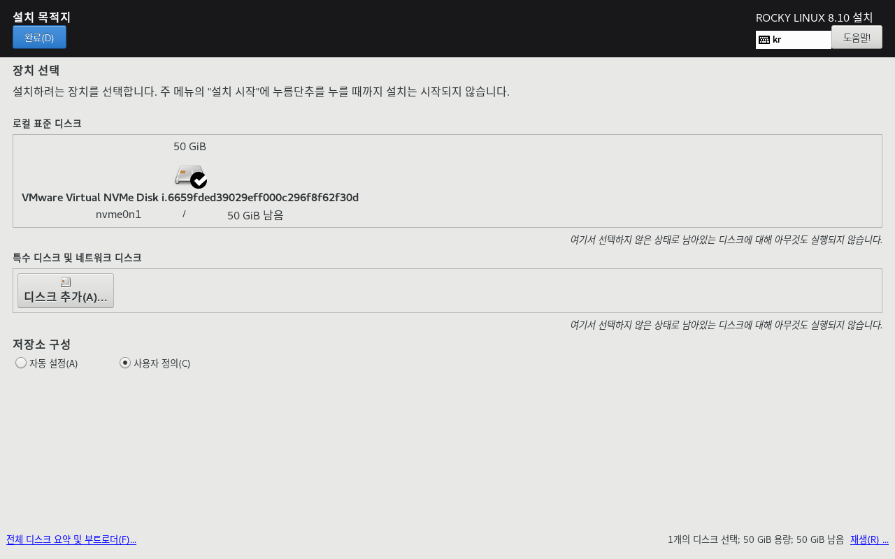 설치 목적지로 파티션 정하기 → 사용자 정의 선택 → 완료 클릭 → 표준 파티션 클릭 → 밑에 + 클릭