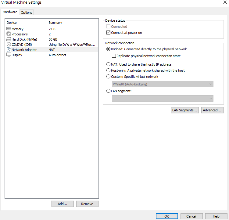 그리고 화살표 쪽 클릭해서 밑에 그림처럼 네트워크 어뎁터 쪽은 bridged로 설정해 주고 사운드카드, usb포트 제거, cd/dvd에 iso파일을 넣어주면 됩니다.