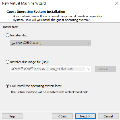 일단 가상머신 깡통을 먼저 만들고 디스크를 넣겠다는 것입니다.