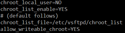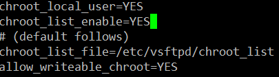 #allow_writeable_chroot=YES ← chroot 적용 시 반드시 추가필요, 접속이 불가하다.