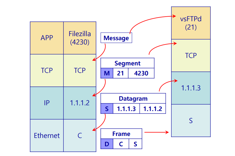 메시지를 밑에 tcp로 보내고 tcp는 filezilla(4230 port)과 21 port를 붙여서 segment라는 정보를 밑에 ip로 보냅니다.