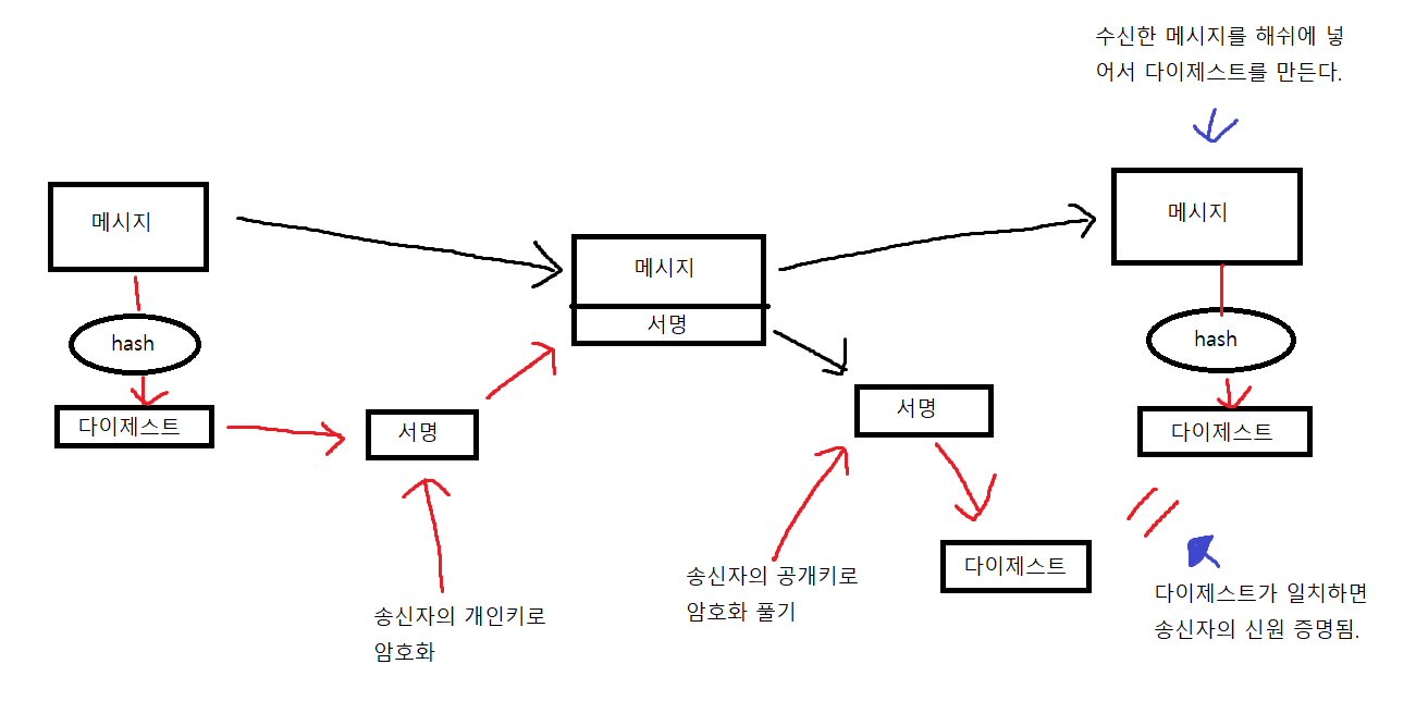 수신자는 받은 메시지와 서명을 분리시킨 후, 서명은 송신자의 공개키로 암호화를 풀고, 메시지는 해쉬함수에 넣어서 나온 다이제스트를 서명에서 암호화를 푼 다이제스트랑 비교를 한 후 같은지 확인하고 같으면 신원이 증명이 됩니다.
