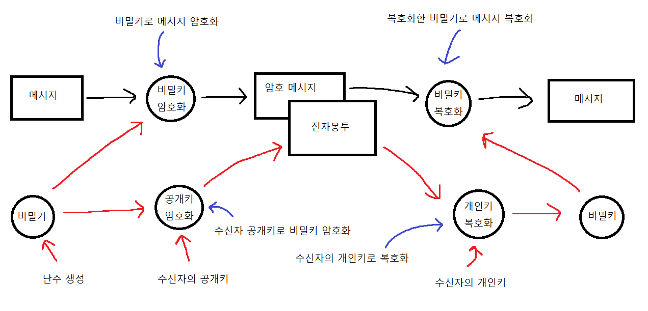 송신자가 비밀키로 암호화한 메시지(암호 메시지), 수신자의 공개키로 암호화한 비밀키(전자봉투)를 같이 보냅니다.