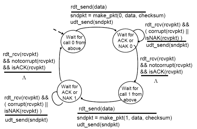 Wait for ACK or NAK 0 → 하위레이어에서 시퀀스번호 0번의 패킷에 대한 ACK나 NAK 응답이 오기를 기다리는 상태