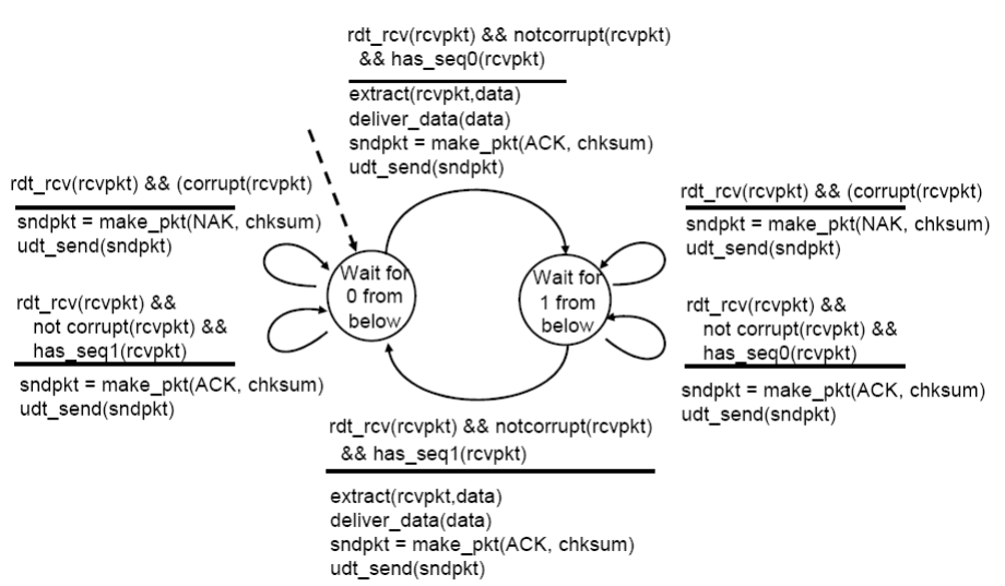 Wait for ACK or NAK 0 → 하위레이어에서 시퀀스번호 0번의 패킷에 대한 ACK나 NAK응답이 오기를 기다리는 상태