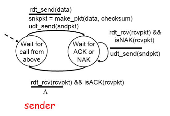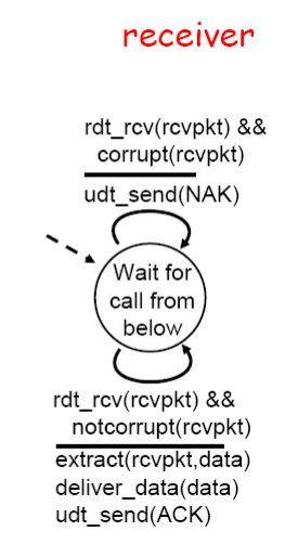 rdt_rcv(rcvpkt) && isNAK(rcvpkt) → 하위 레이어로부터 NAK를 받음.