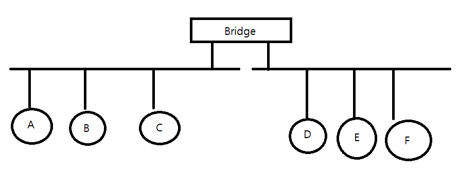 일정 수준 이상의 컴퓨터가 늘어나게 된다면(노드의 수가 증가하면) 콜리젼이 갑자기 발생을 할 수 있습니다. 그걸 방지하려면 네트워크를 나누어야 합니다. 여러 가지 방법이 있지만 이번에 배운 부분은 브릿지로 나누는 방법입니다.