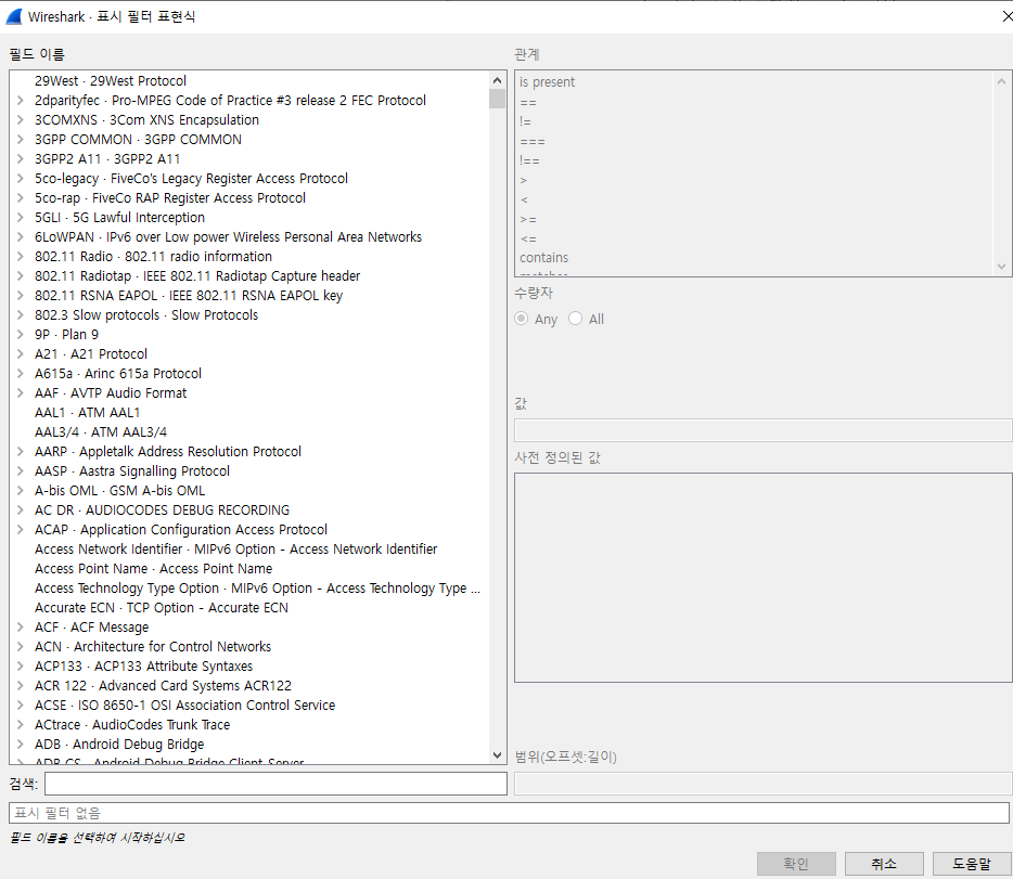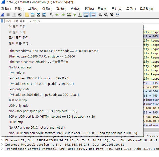 - ip.src: 출발지 IP가 있는 패킷 (IPv4 패킷에만 존재)
